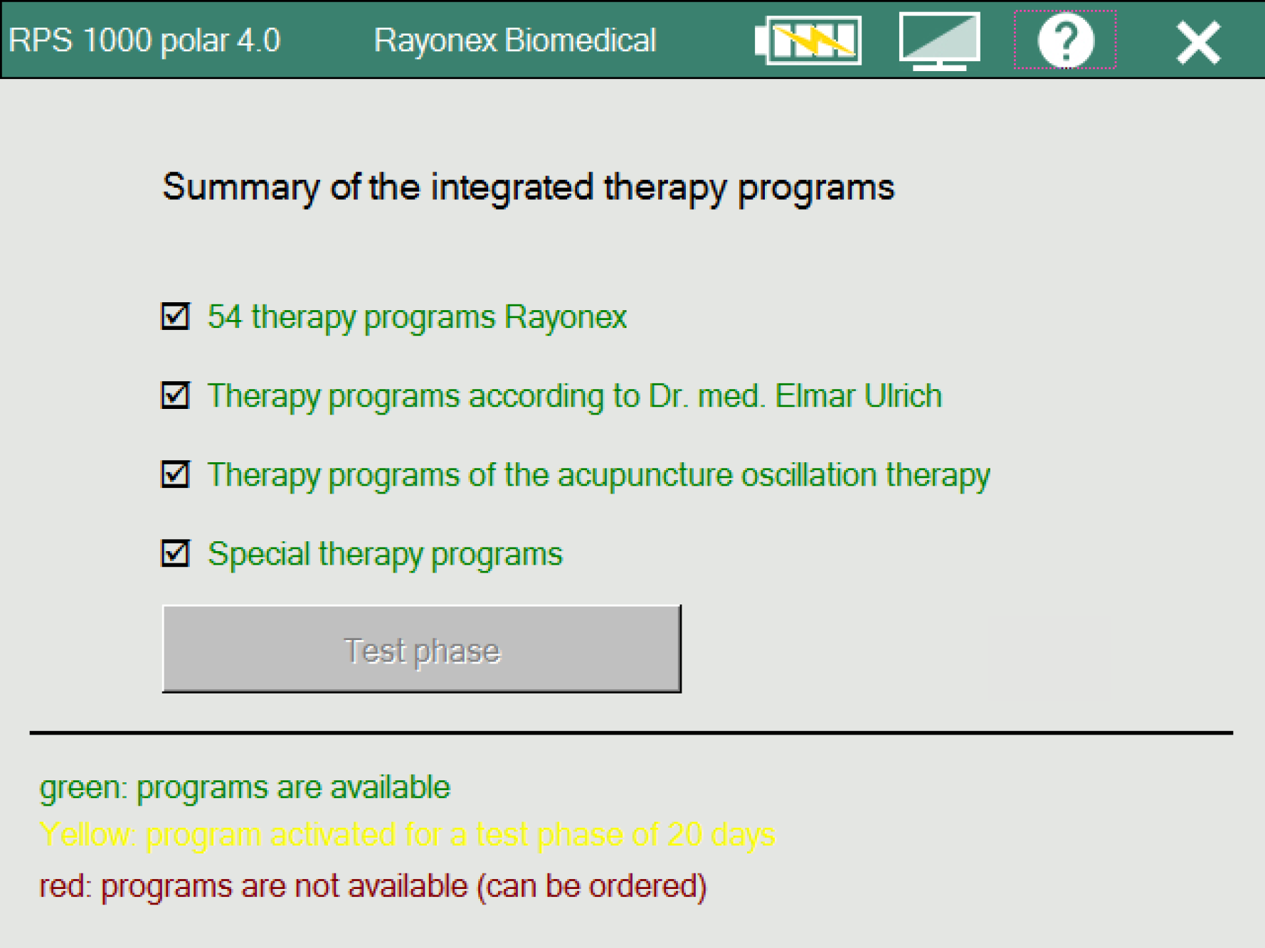 This module for the Rayocomp PS 1000 polar 4.0 provides access to Dr Elmar Ulrich’s 22 treatment programs.
