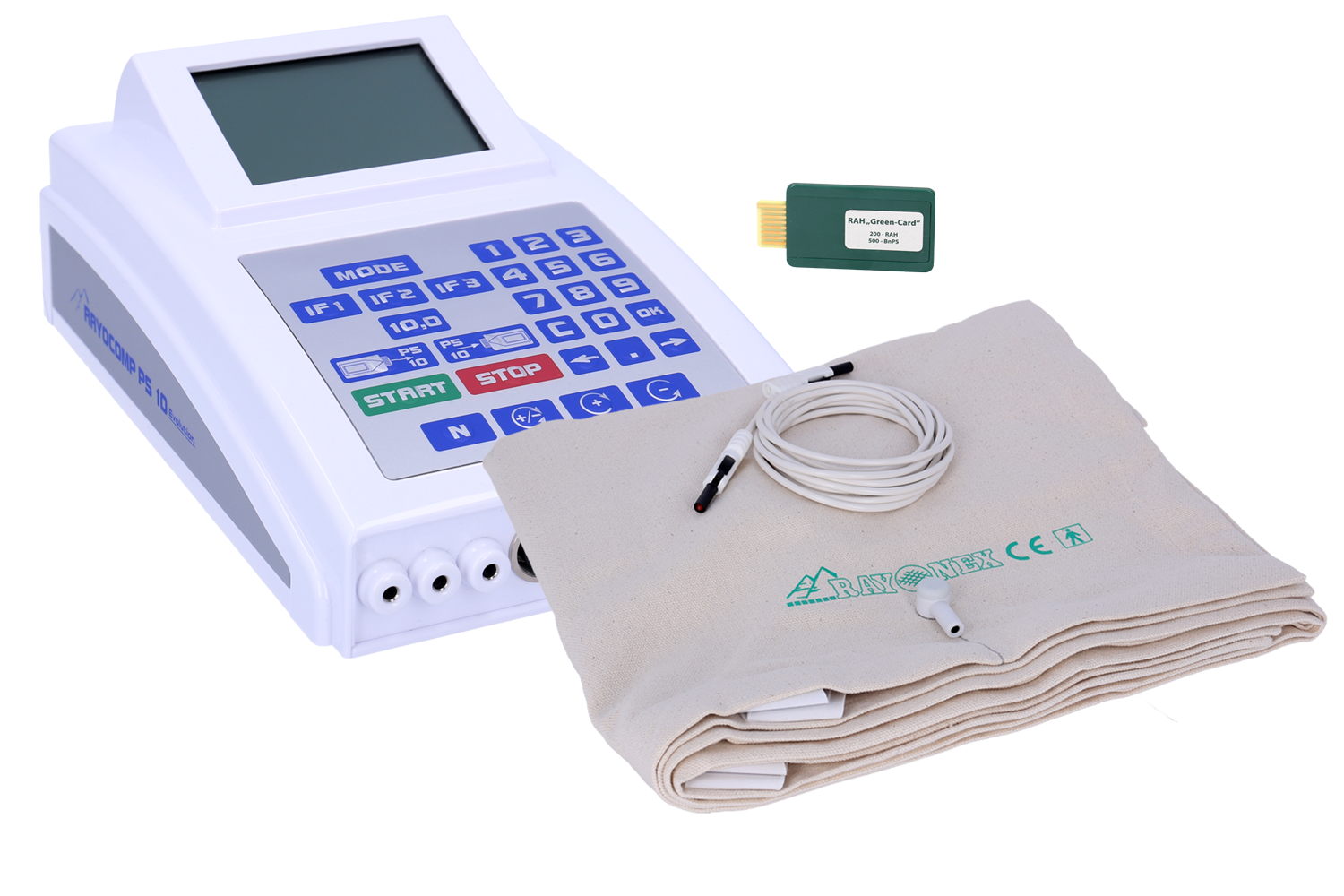 We offer the Rayocomp PS 10 in an attractive set with a fitted sheet as a Fabric DetectorThe frequencies and frequency spectra of Bioresonance according to Paul Schmidt are transmitted to the organism with the help of special, patented detectors. Fabric Detectors with stainless steel woven through... More and a Green-CardUp to 200 individual RAH programs and their harmonisation times can be stored on a Green-Card. The client can use the RAH programs compiled by the practitioner on a Green-Card... More. With the module M10, the Rayocomp PS 10 Set contains the RAH Human for analysis and harmonisationWhen frequency spectra are transmitted to the body via the patented detectors using Bioresonance devices according to Paul Schmidt, this is known as harmonisation. Harmonisation refers to the process of... More: the 1,800 RAH programs currently available can be used for both energetic testing and harmonisationWhen frequency spectra are transmitted to the body via the patented detectors using Bioresonance devices according to Paul Schmidt, this is known as harmonisation. Harmonisation refers to the process of... More. An additional component of this module is the Test Protocols for specific illnesses and thus holistic, tried-and-tested compilations of RAH programs, on the basis of which energetic deficits can be clarified. The Test Protocols guide you through the RAH Human to ensure that the programs are tested specifically for the anamnesis. You can save the test results on a Green-CardUp to 200 individual RAH programs and their harmonisation times can be stored on a Green-Card. The client can use the RAH programs compiled by the practitioner on a Green-Card... More and use them for the treatments. You will also receive the RAH Compendium, which contains detailed information on the RAH and the RAH programs. Of course, all available modules can also be used with this bioresonance device. You can find out more about the modules and possible applications under ‘Accessories’.