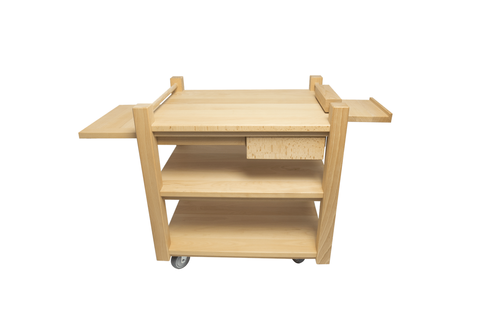 The solid beech mobile table is perfect for work involving Bioresonance according to Paul Schmidt. The table complements the solid beech treatment chair, providing proper positioning for Bioresonance devices according to Paul Schmidt. The table can be easily moved around the treatment room. It has three shelves, a pull-out tray, and a drawer. An additional shelf on the right-hand side of the roller table is ideal for the Rayotensor and the corresponding Stand. In total, the table provides enough space for a Rayocomp PS 1000 polar 4.0 or a Rayocomp PS 10, as well as accessories such as the Rayoscan® Pads.